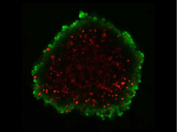 HepG2 球體的共聚焦激光掃描部分。 HepG2 細(xì)胞球體使用基于瓊脂糖的液體覆蓋技術(shù)生成,并轉(zhuǎn)移到 µ-Dish 35 mm、高壁生物惰性培養(yǎng)皿。 FDA(綠色)表示外球體層的活細(xì)胞。 PI(紅色)標(biāo)記壞死球體中心內(nèi)的死細(xì)胞。 顯微鏡:蔡司 LSM 710,平面復(fù)消色差物鏡 10x/0.45。 比例尺為 200 µm。